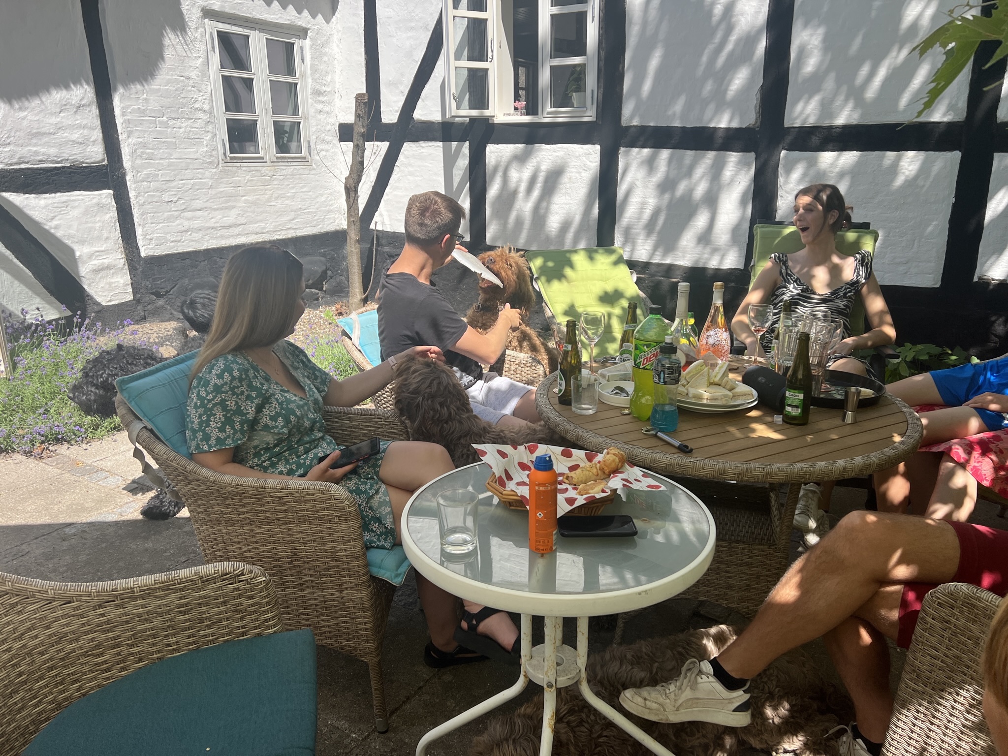 Her er altid gang i den, og hundene er selvfølgelig med, hvad enten det er almindelig mandag eller som her sommerfest med børn og børnebørn.